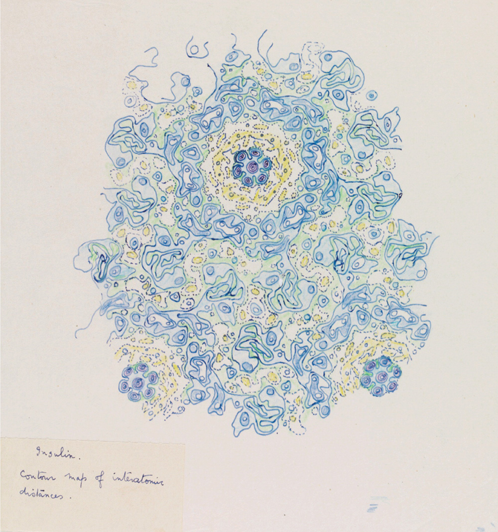 Hodgkin began her work on insulin in 1934 as a twenty-four-year-old researcher at Oxford, where she first observed the ‘beautiful shining colourless rhombohedra’ of the hormone’s crystals under a microscope. Insulin’s structural complexity, however, meant that it would take three decades for Hodgkin to determine its atomic architecture, the discovery on which the production of synthetic insulin with a reliable, standardised potency is based.